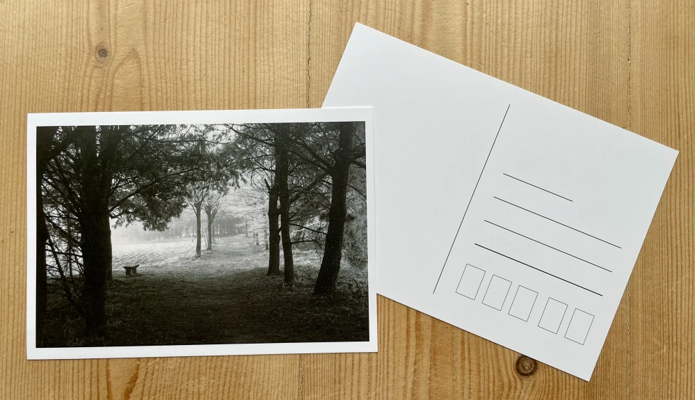 Pohlednice A6 (105 × 148 mm), černobílá s motivem zimního lesa.